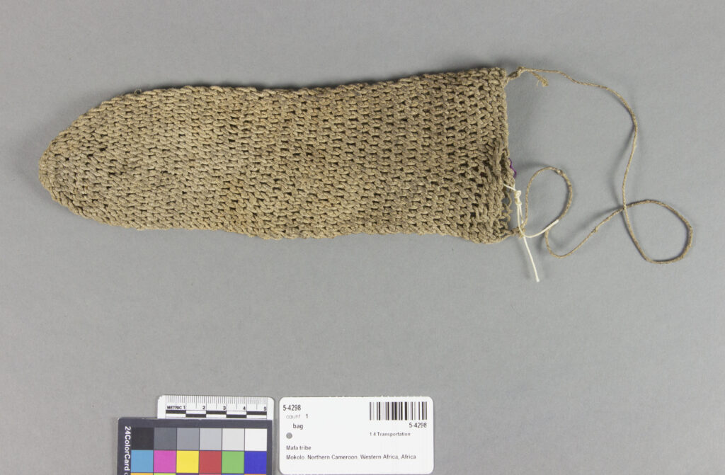 The Mafa sack was collected in 1965 by Paul Hinderling and donated to the Phoebe A. Hearst Museum at Berkeley. It is made from bean fiber cordage, materials that would have been locally available. The object is catalogued with the technique explicitly identified: knotless netting. This is not a guess. It is documentation.